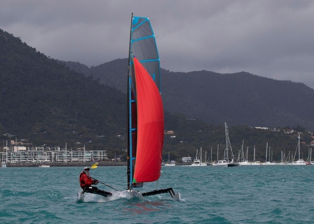 The 4.4 metre fun and fast WETA trimarans are making their debut at Airlie Beach and today the spoils went to Andy Duffield with the aptly named ‘Wee Tri’. There was little in it, with Todd McVey’s The Other Office pipped to the post by less than a minute.